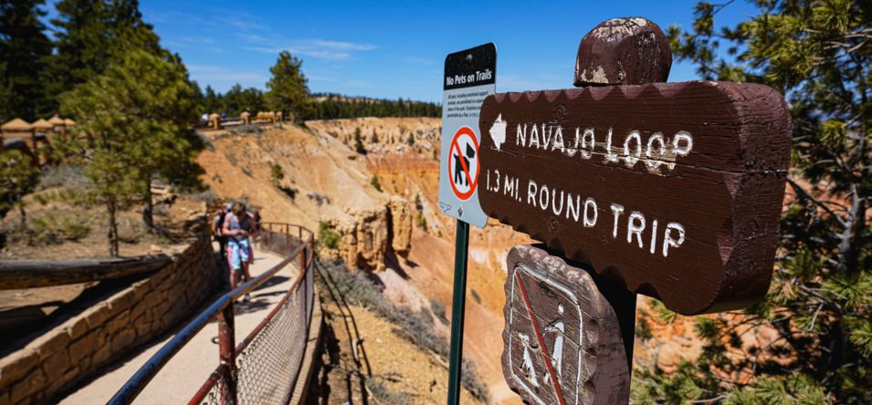 Pets are not permitted on any of the trails or in the backcountry in Bryce Canyon. Pets are only allowed on paved surfaces, including park roads and campgrounds, the Shared-use Path, paved viewpoints (all viewpoints except Piracy Point), and the 1/2 mile (0.8 km) section of Rim Trail between Sunset and Sunrise Points.